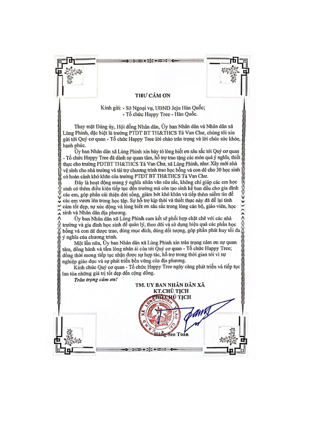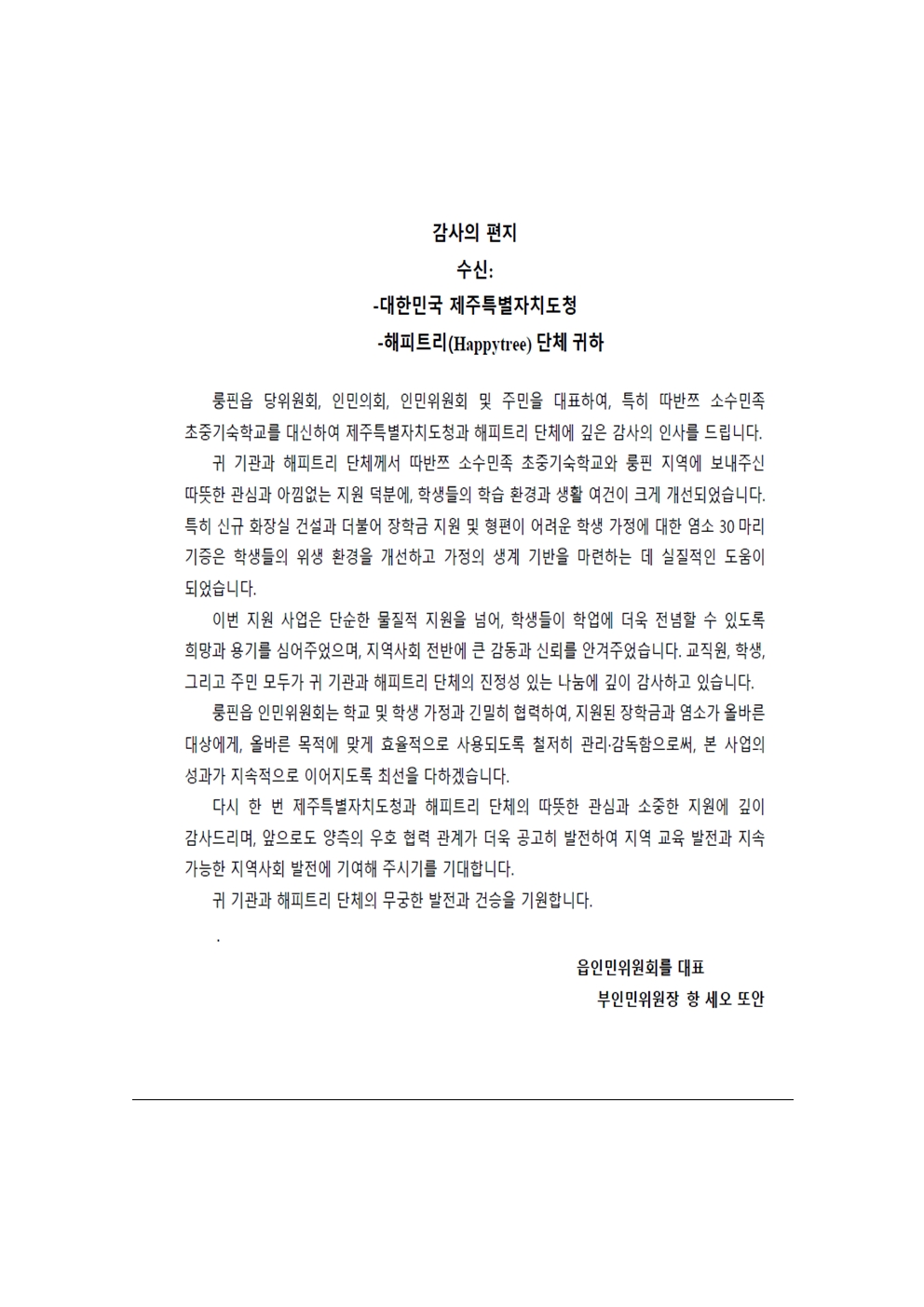 2025 ODA 사업을 진행한 따반즈와 룽피엔에서 보내온 감사편지입니다