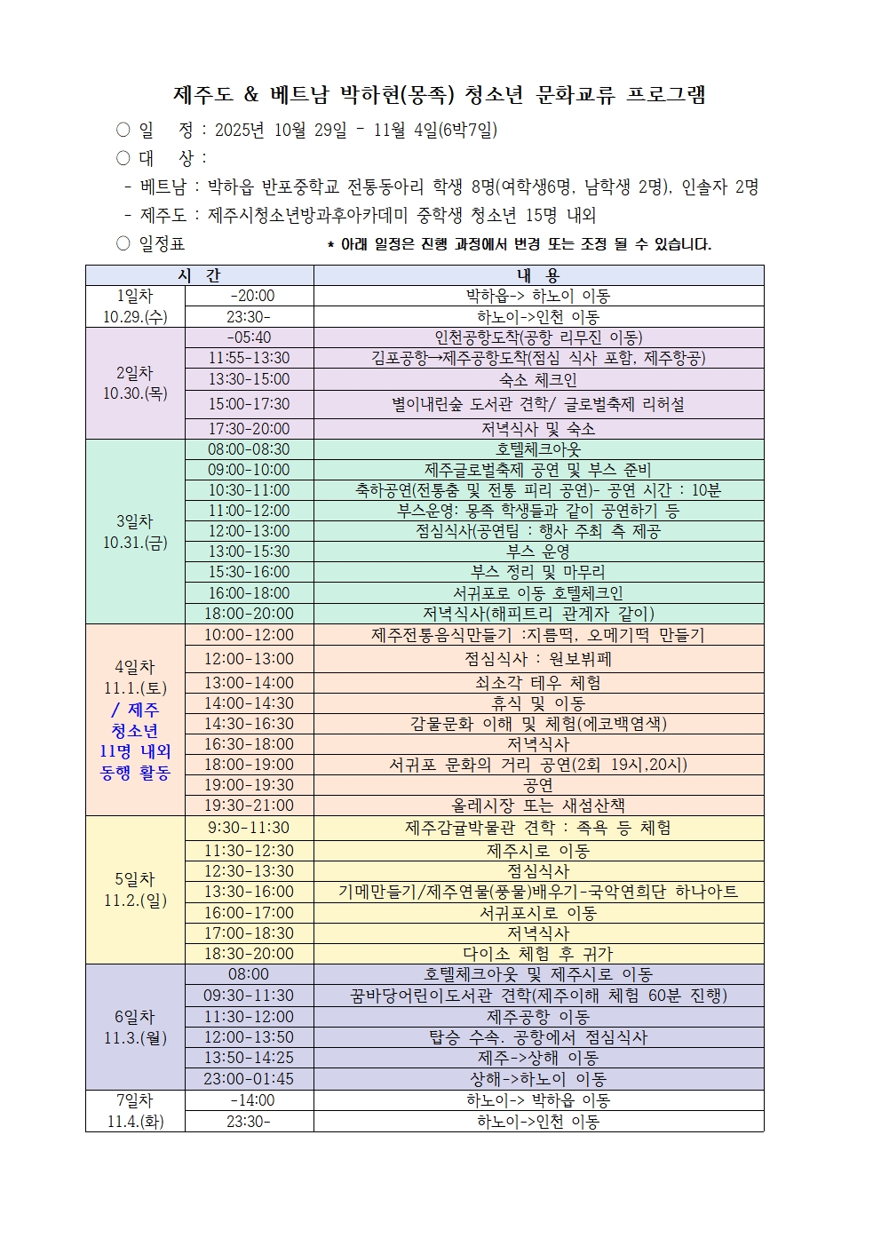 - 기간: 2025.10.29.(수) ~ 11.4.(화) - 장소: 제주소 일대 - 대상 : 박하읍 반포민족중학교 학생 8명, 제주청소년 11명, 그 외 베트남 및 해피트리 등 관계자 - 주요 일정 10.29.(수) 베트남-> 제주 이동 10.30.(목) 제주도서관 별이내리는 숲 방문, 제주특별자치도교육청 글로벌 축제 준비 10.31.(금) 제주특별자치도교육청 글로벌 축제 축하공연 및 부스 운영. 제주특별자치도청 방문 11.1.(토) 제주음식만들기 체험(오메기떡, 기름떡), 쇠소각 카누 체험, 제주감물염색체험, 귤 따기 체험 *제주시청소년수련관방과후아카데미 소속 중학생 11명 동행 11.2.(일) 제주감귤박물관 견학 및 족욕 체험. 기메만들기와 제주타악기 배우기 11.3.(월) 제주꿈바당어린이도서관 견학, 제주->하노이 이동 11.4.(화) 하노이->박하읍 이동 |