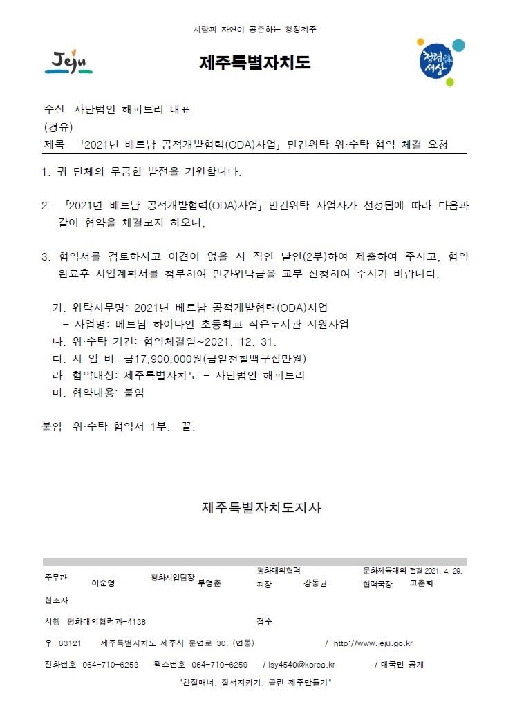 2019년 베트남 공적개발협력(ODA) 사업(사업비 총 10,000,000원)에 이어 2021년 베트남 공적개발협력(ODA) 사업(사업비 총 17,900,000원)에도 선정되었습니다. 코로나19 팬더믹 사태로 인해 작년 2020년 베트남 현지에 방문하지는 못했지만 베트남 현지의 김상호 박사의 도움으로 하이타인 초등학교에 해피트리 작은도서관 2호를 완공(리모델링 및 신축)할 수 있었고, 이번 2021년 ODA사업에 선정됨에 따라 해피트리 작은도서관 2호에 들어갈 각종 기자재를 제주특별자치도의 지원금으로 설치할 수 있게 되어 하이타인 초등학교 어린이들에게 좀 더 넉넉히 지원을 진행할 수 있게 되었습니다. 많은 후원자분들의 귀한 후원금으로는 해피트리 작은도서관 1호(동프엉 초등학교)와 2호(하이타인 초등학교)에 각종 도서를 지원하여 베트남 어린이들의 꿈과 미래를 키우는데 도움을 주려 합니다. 사단법인 해피트리가 함께 크는 아름드리 행복나무로 자랄 수 있도록 응원해주시고 함께해 주셔서 진심으로 감사드립니다. |