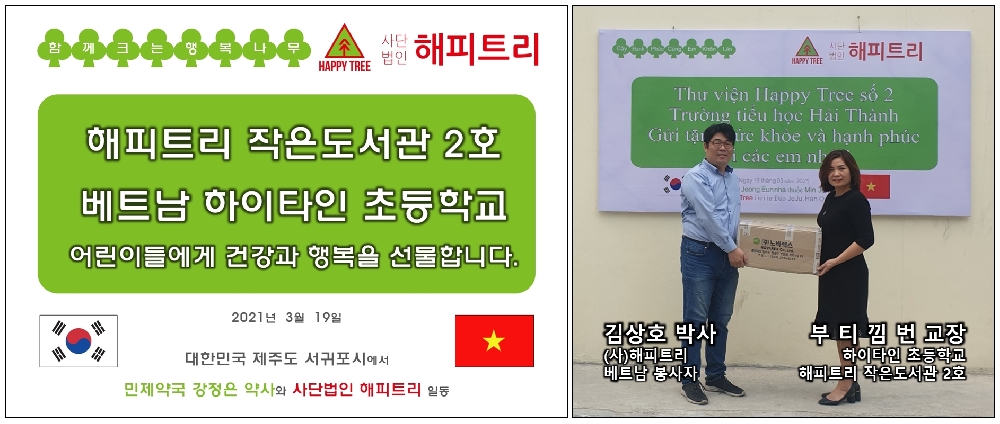 해피트리 작은도서관 2호가 심어진 베트남 하이타인 초등학교에서 어린이 영양제 160박스 후원품 전달식이 있었습니다. 대한민국 제주특별자도 서귀포시에 위치한 민제약국의 강정은 약사님께서 후원해주신 소중한 어린이 영양제를 베트남 현지에서 코디네이터 역할을 해주시는 김상호 박사님께서 직접 방문하셔서 저희 사단법인 해피트리를 대표해 하이타인 초등학교 부 티 낌 번 교장선생님과 학생들에게 전달해주셨습니다. 여러분들의 행복한 후원과 노력이 베트남의 미래 행복나무 하이타인 초등학교 어린이들에게 좋은 자양분이 될 수 있게되어 정말 기쁘고 감사드립니다. |