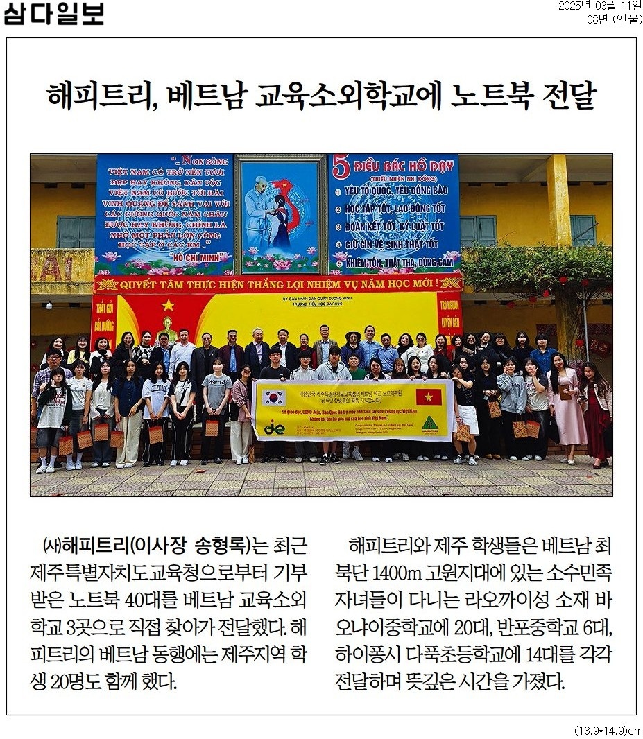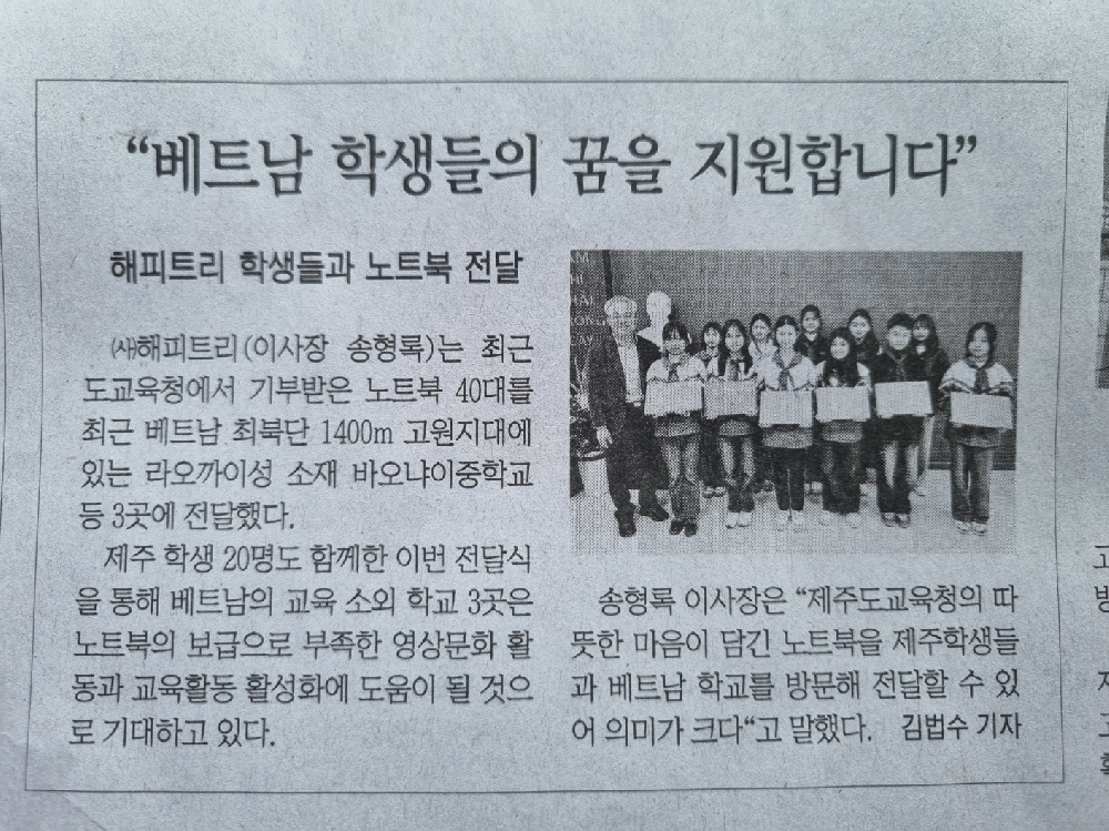 □ 기부받은 노트북은 베트남 최북단 1,400m 고원지대에 있는 소수민족자녀들이 다니는 라오까이성 소재 바오냐이중학교에 20대, 반포중학교 6대, 그리고 하이퐁시 다푹초등학교에 14대를 전달하였다. □ 특히 다푹초등학교 노트북 14대는 제주 학생 20명이 직접 학교를 방문하여 전달하는 뜻깊은 시간을 가졌다. □ 다푹초등학교는 정보통신 시설이 부족한 학교상황에서 기부 받은 노트북을 학년별로 지원하여 학년별 교육활동에 활용할 수 있도록 할 예정이며 그로 인해 교육활동 활성화에 도움이 될 것이라고 전하였다. □ 라오까이성 소재 학교는 모두 기숙학교로 이번에 기부받은 노트북을 활용해서 방과후에 각 기숙사에서 애니메이션 시청 등 학생들에게 부족한 영상문화 활동을 할 수 있도록 지원 할 계획이라고 밝혔다. □ 송형록 (사)해피트리 이사장은 “제주특별자치도교육청의 따뜻한 마음이 담긴 노트북을 제주학생들과 직접 베트남 학교를 방문하여 전달할 수 있어 그 의미가 더 컸다‘고 전하였다. 다푹초등학교 부티껌번 교장선생님도 ”제주학생들이 직접 학교를 방문해 주고 우리 학생들과 행복하게 교류하는 모습을 보면서 앞으로도 계속 인연의 끈이 이어지길 바란다’고 전했다. |